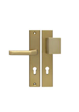 Klamki do drzwi zewnętrznych na długim szyldzie Alubrass Neo (rozstaw 92, patyna)