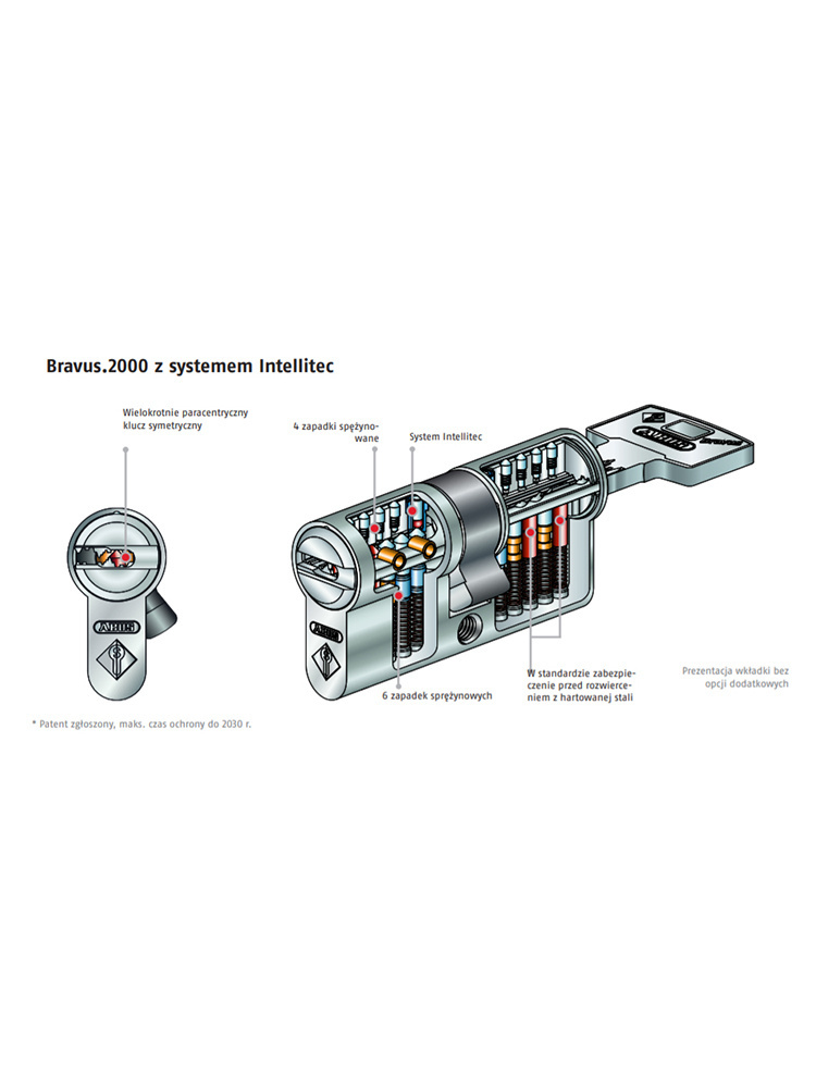 System Bravus to połączenie silnej ochrony prawnej z wysoce zaawansowanym technicznym zabezpieczeniem przed kopiowaniem, gwarantując wysoki stopień zabezpieczenia przed nieuprawnionym dorabianiem kluczy. Wszystkie 4 poziomy bezpieczeństwa systemu Bravus obejmują system Intellitec — opracowany niedawno nowatorski układ kontrolny na kluczu i wewnątrz bębenka. System Intellitec zapewnia unikalne połączenie ochrony patentowej do roku 2030* i nieograniczonej ochrony znaku towarowego z najwyższym stopniem technicznych zabezpieczeń klucza przed kopiowaniem.