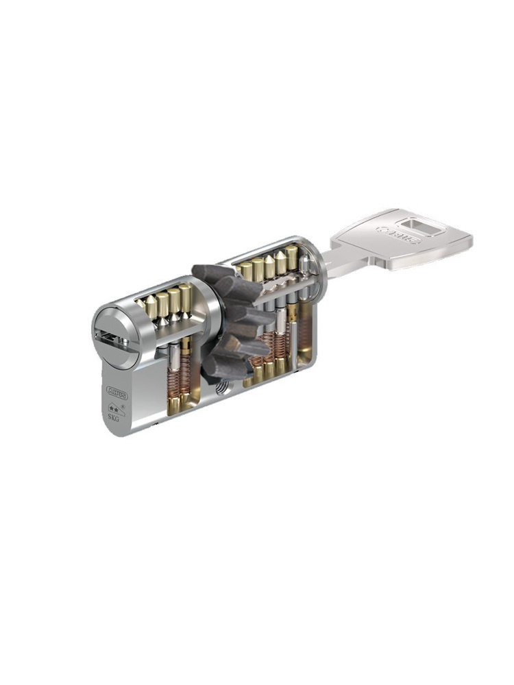 System klucza dwustronnego X12R z poziomym wkładaniem klucza zapewnia maksymalną wygodę, ponieważ klucz posiada wgłębienia, ale nie ma ostrych krawędzi. Wkładka z zębatką X12R jest standardowo wyposażona w funkcję awaryjną, co oznacza, że jeśli klucz zostanie pozostawiony po jednej stronie zamka, drzwi nadal można zamknąć z drugiej strony drugim kluczem. Siłowniki X12R Euro są standardowo certyfikowane zgodnie z SKG. Oznacza to, że system spełnia wysokie wymagania dotyczące odporności na atak. Opatentowany kołek blokujący wewnątrz wkładki weryfikuje również, czy klucz posiada odpowiednie uprawnienia, zapewniając w ten sposób prawną i techniczną ochronę przed kopiowaniem. Specjalne kołki zabezpieczające przed przewierceniem wykonane z hartowanej stali specjalnej zapobiegają manipulacji cylindra. Karta bezpieczeństwa zapewnia dodatkową ochronę, ponieważ należy ją okazać przed zamówieniem dodatkowych wkładek i kluczy.