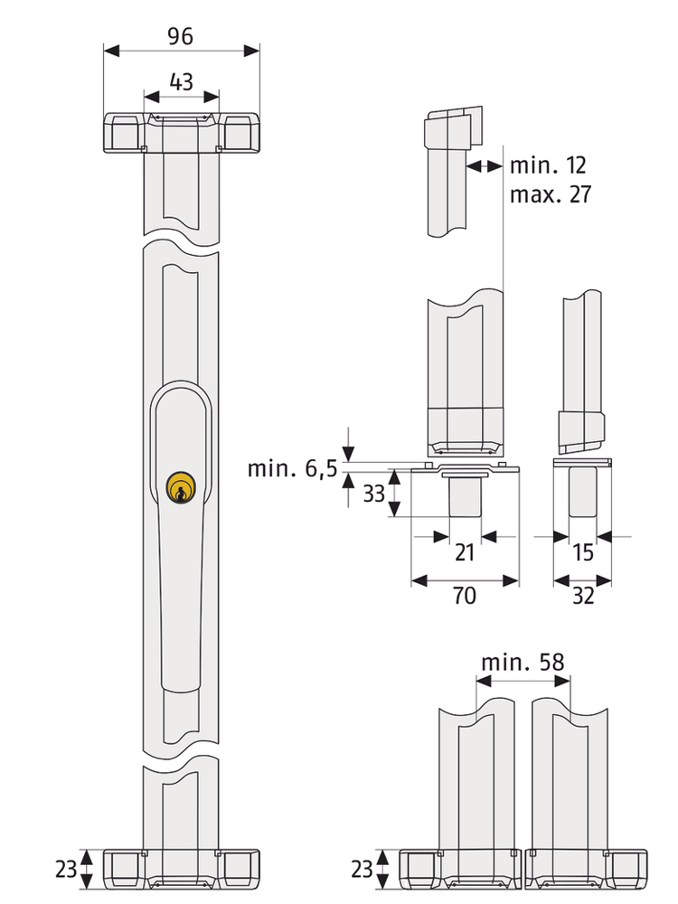 - Zamek sztabowy okienny z ryglowaniem 2-punktowym do okien i drzwi balkonowych otwieranych do wewnątrz zamiast klamki okiennej