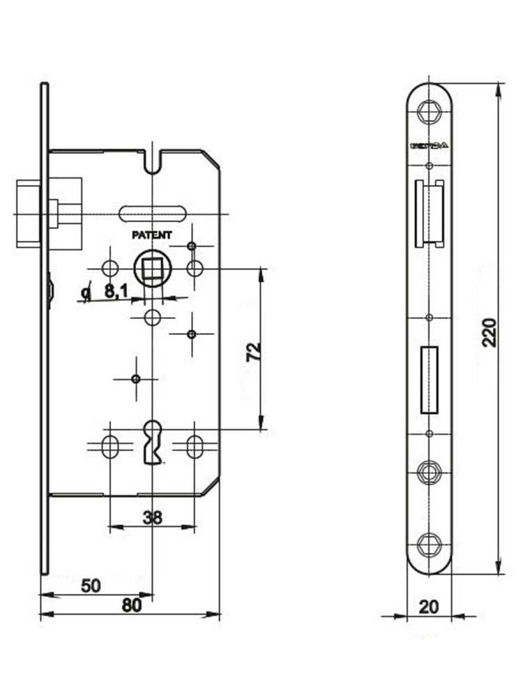 Wymiary zamka na klucz Gerda ZW 100 72/50 ocynk złoty